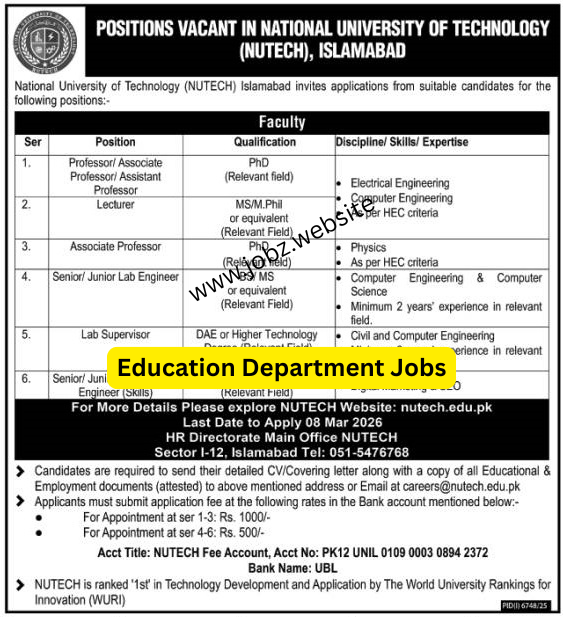 The national university of modern languages invites applications from the highly qualified and energetic applicants in advertisement on 20 february 2026. Candidates required for associate professor, professor , assistant professor, senior lab engineer, lecturer, lab supervisor, and senior and junior lecturer.
