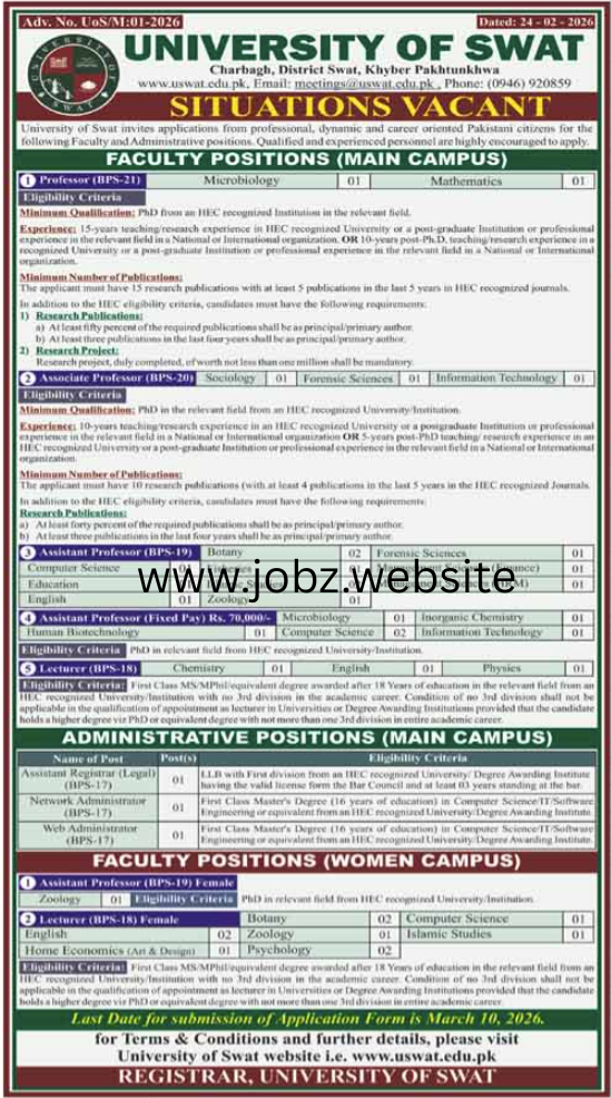 All candidates apply for the latest jobs of university of swat before the last date shown in the advertisement on 10 march 2026.